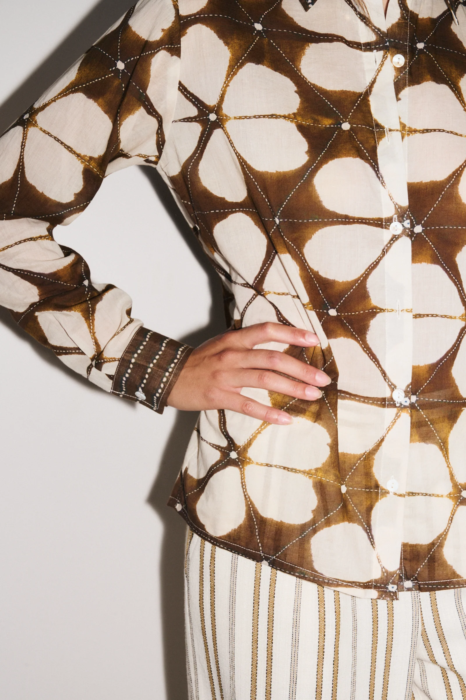 Portez-la rentrée dans un pantalon ou une jupe pour structurer la silhouette, ou laissée libre sur un jean pour un look casual chic. Les accessoires simples permettront de mettre en valeur l’imprimé unique du tissu.