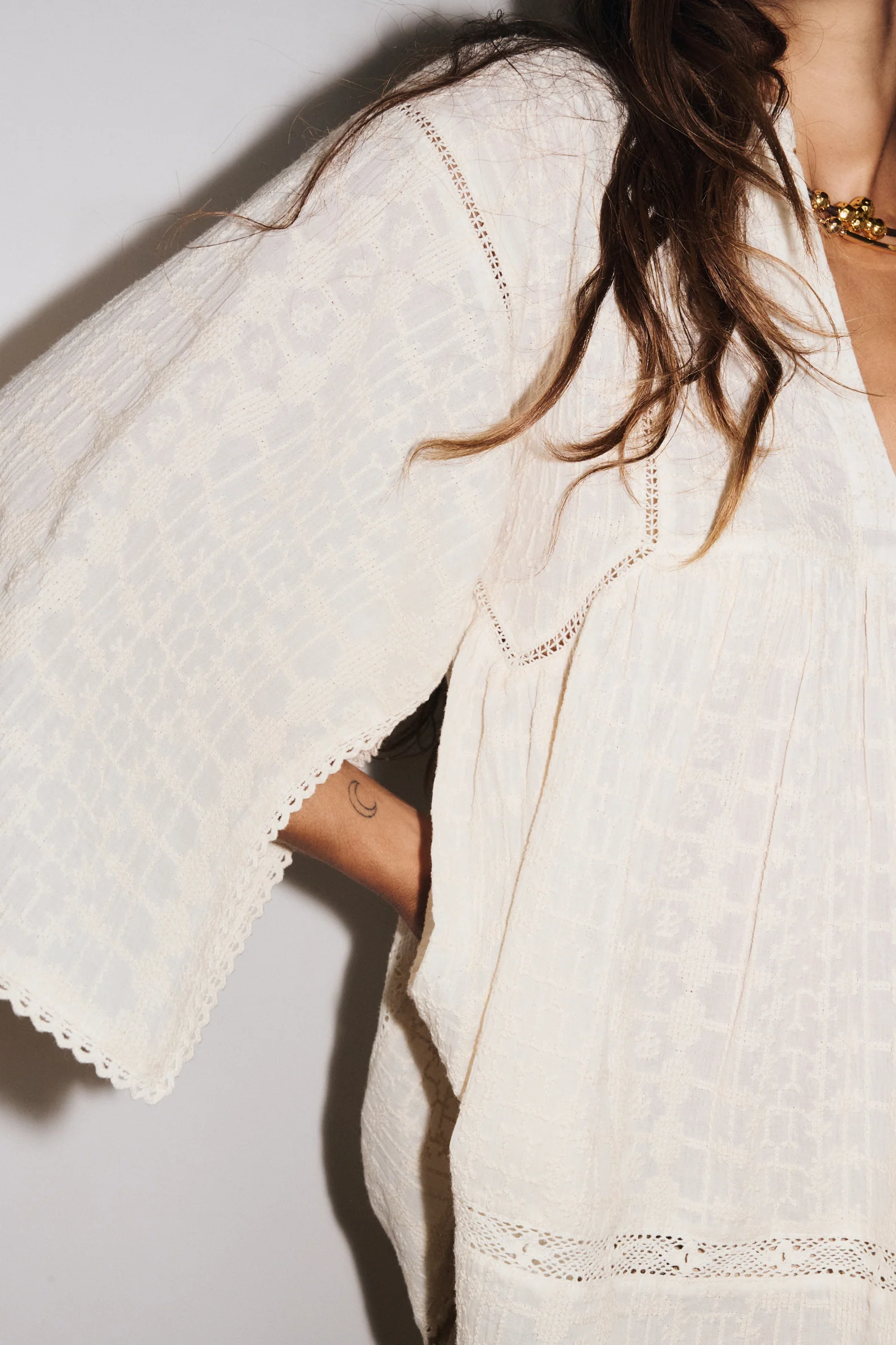 Cette tunique 3/4 ĂloĂŻse se distingue par son tissu jacquard dĂ©licat et ses incrustations de dentelle, qui crĂ©ent un effet plastron Ă©lĂ©gant sur la poitrine. Lâemmanchure basse et les fentes sous les manches assurent confort et libertĂ© de mouvement, tout en apportant un dĂ©tail dynamique qui apparaĂźt Ă chaque geste. Le col tunisien et la longueur 3/4 renforcent lâallure moderne et fĂ©minine de la piĂšce.