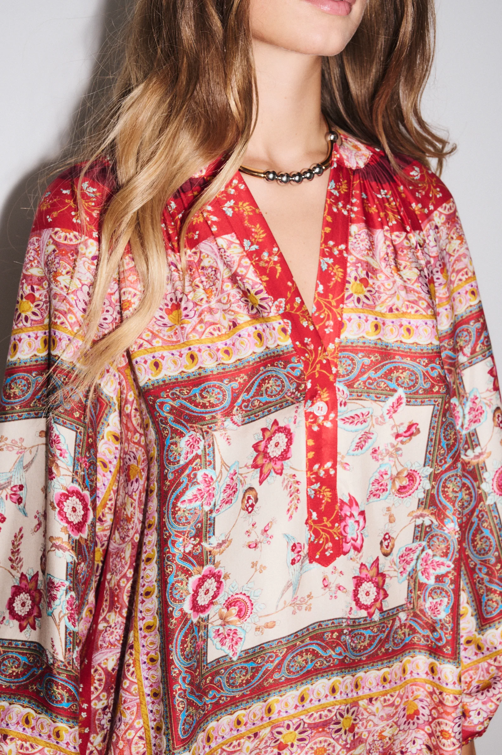 Cette tunique manches longues, en tissu fluide imprimé Made in Como, allie confort et sophistication. Ses manches bouffantes, ses poignets élastiqués, les fronces au col et au bas, ainsi que l’encolure ouverte avec bouton nacré apportent de la légèreté et du mouvement à la silhouette.