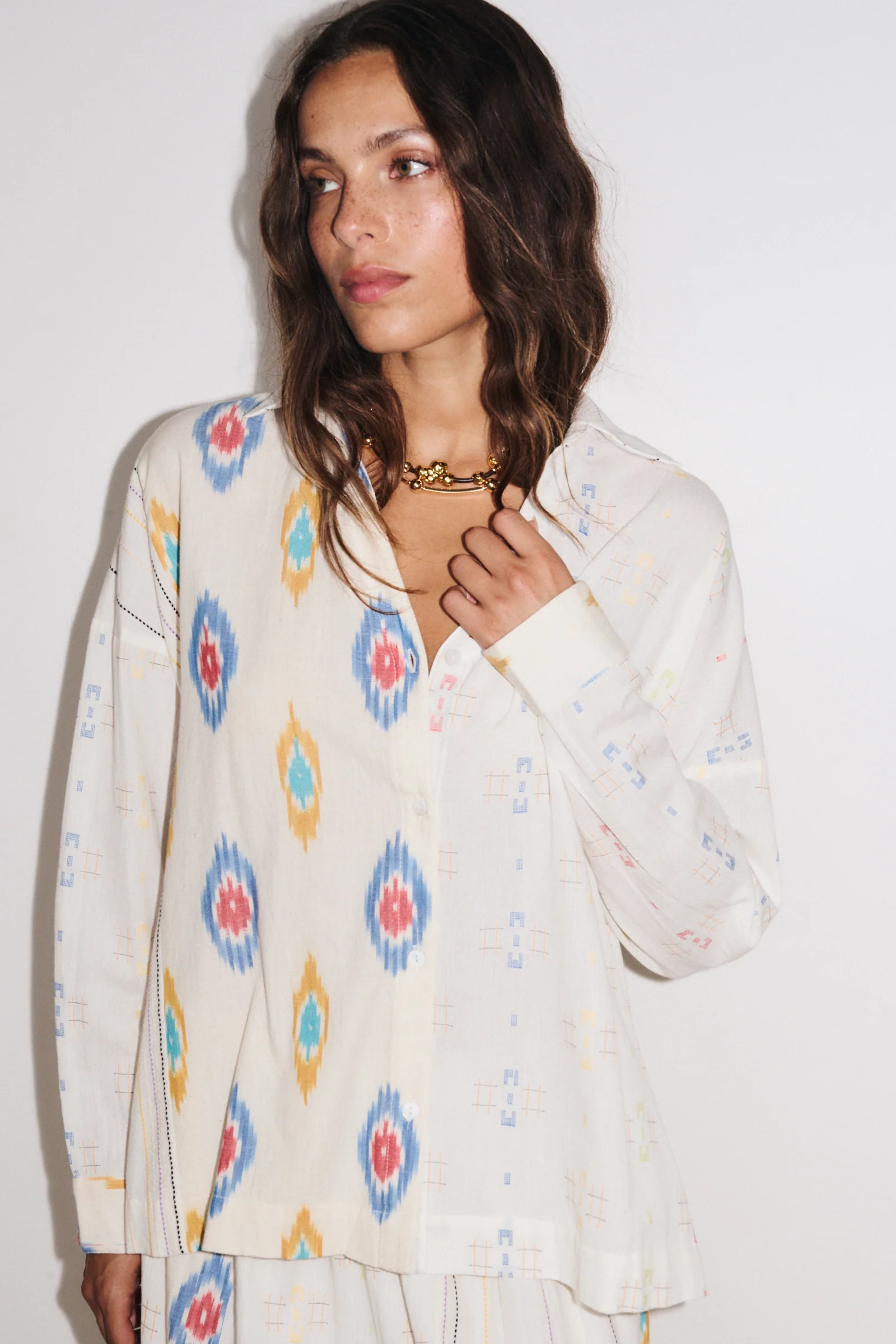 La chemise manches longues Kaia reprend les codes de la chemise classique tout en adoptant un format XXL pour un effet moderne et confortable. Son style patché mix & match, combinant différents motifs ikat et rayures déstructurées, apporte originalité et caractÚre à la piÚce. Le petit col rond à volant et les fronces sur les cÎtés ajoutent volume et féminité, tandis que les boutons en nacre complÚtent les finitions avec élégance.