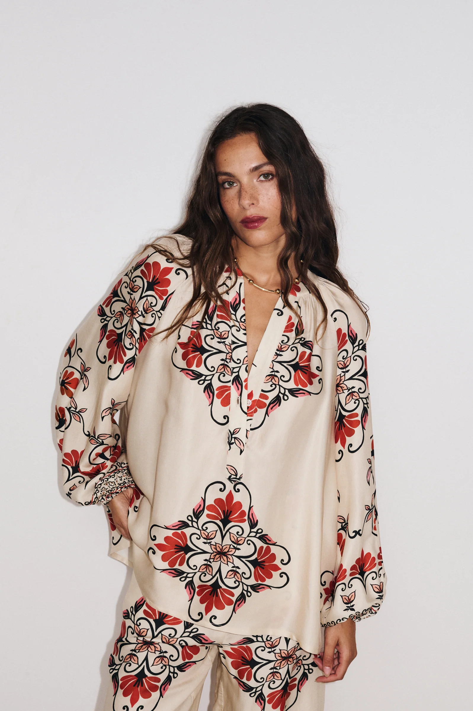 Confectionnée en tissu fluide imprimé Made in Como, la tunique Cleliana se distingue par ses manches bouffantes, poignets élastiqués, fronces au col et au bas, et encolure ouverte avec petit bouton nacré. Une piÚce chic et versatile qui apporte élégance et confort à vos tenues.