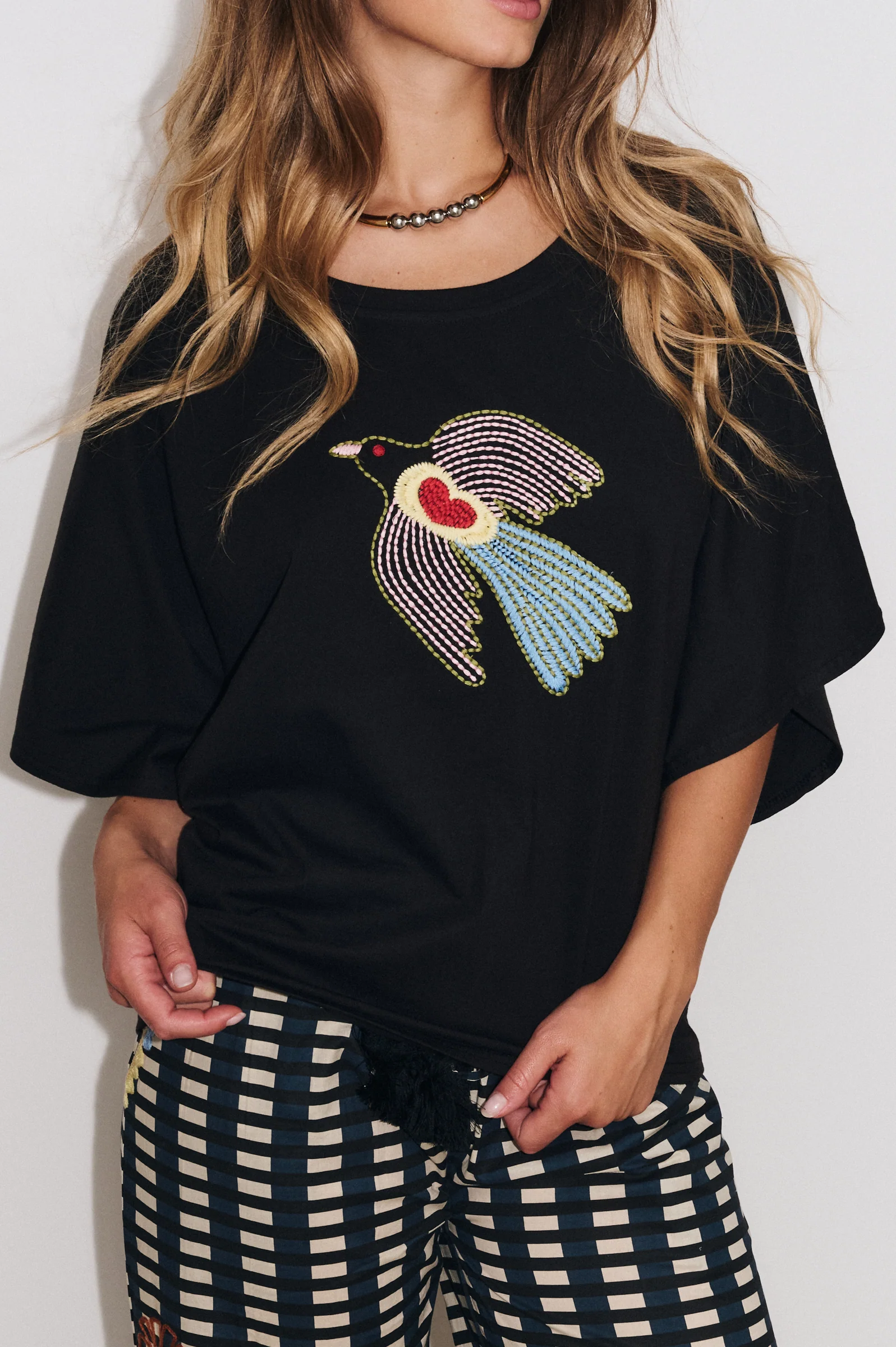 Confectionné en jersey doux, ce top brodé allie confort et féminité avec subtilité. Sa coupe fluide à manches longues jusqu’au coude et sa forme en T offrent une silhouette moderne et décontractée, tandis que son encolure dégagée révèle le port de tête avec élégance. La broderie oiseau placée sur le devant apporte une touche poétique et délicate, signature d’un look à la fois casual et raffiné.