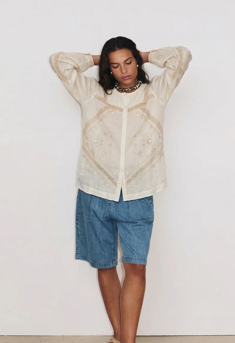 Cette chemise se distingue par son encolure arrondie et son plastron travaillé grâce à de délicats jeux de pintucks. La manche légèrement bouffante, terminée par un poignet fermé par un petit bouton, apporte volume et féminité à la pièce. Les boutons en nacre ajoutent une touche raffinée, tandis que le fit normal et l’emmanchure en place assurent confort et facilité de port au quotidien.