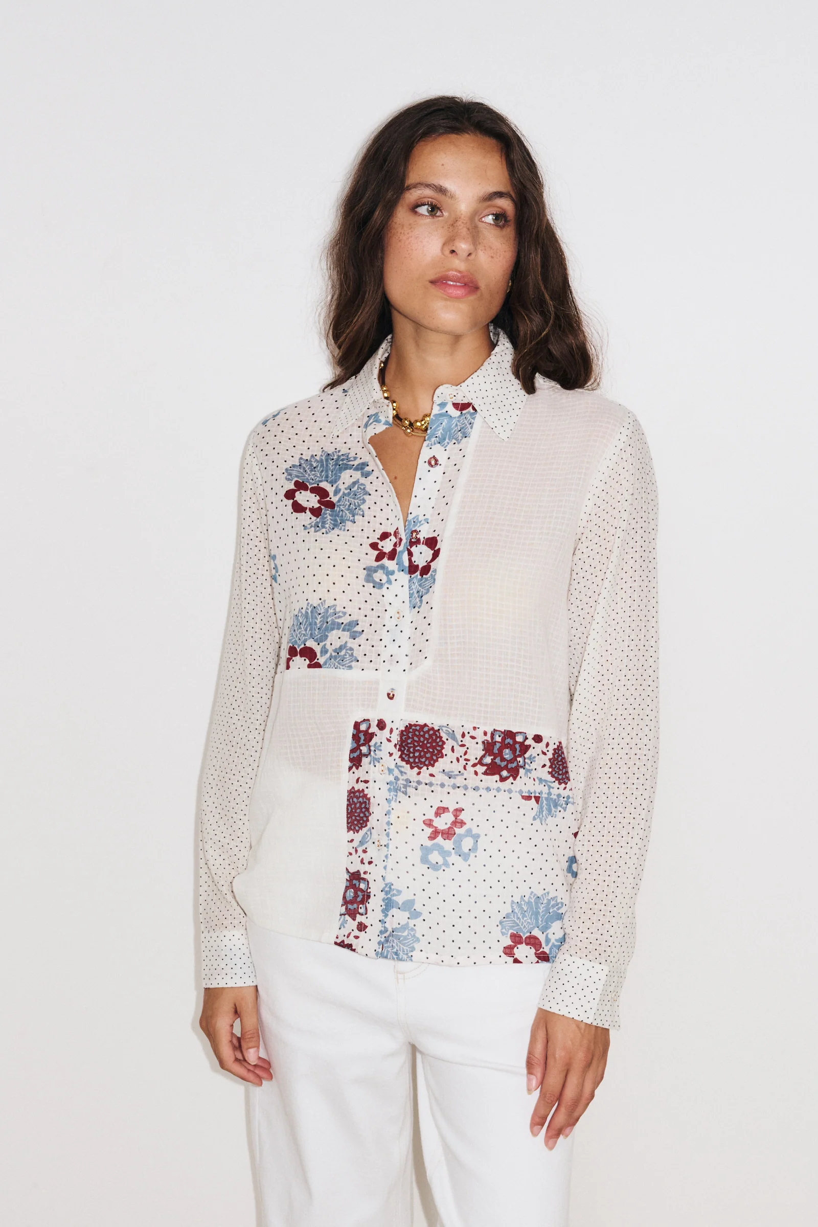 La chemise Ă manches longues Sunny sĂ©duit par son jeu de patchs qui crĂ©e un effet mix & match original. Les imprimĂ©s floraux se mĂȘlent aux motifs Ă pois pour apporter caractĂšre Ă la piĂšce. Sa coupe reprend le fit de la chemise classique, offrant une silhouette facile Ă porter au quotidien. Polyvalente et moderne, elle sâassocie naturellement Ă un jean pour un look simple et stylĂ©.